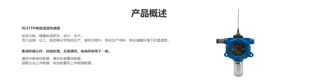 XL31TH智能温湿传感器,是按低功耗、隔爆标准研发、设计、生产。用于监测,化工、医药等化学物品生产、储存过程中,特定生产场所、特定储藏环境下的温湿度。